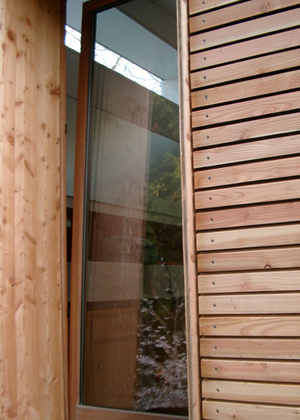 Die Außenfassade ist mit unbehandelten Lärchenholzleisten verkleidet und die Holzfenster konnten wegen der tiefen Laibungen ebenfalls aus unbehandelter Lärche gefertigt werden. Im Innenbereich wurde der alte Dielenboden aufgearbeitet und mit einem dunkelroten Linoleumboden kombiniert. Der gleiche Linoleumbelag wurde in den Bädern auf wasserfestes Sperrholz aufgezogen und dient dort als Wandverkleidung im Bereich der Waschtische.