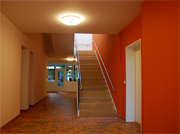 Die Erweiterung im 1.OG wurde komplett als Holzrahmenbau geplant und ausgeführt, die Gesamtbauzeit konnte dadurch auf 7 Monate verkürzt werden. Die Montage des „Rohbaues“ erfolgte innerhalb von 2 Werktagen, erst anschließend wurde die Geschossdecke geöffnet und Alt- und Neubaubau mit einem lichtdurchfluteten Treppenhaus verbunden. Zusätzliche Oberlichter sorgen für angenehme und stimmungsvolle Belichtungen im Erdgeschoss.